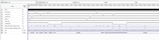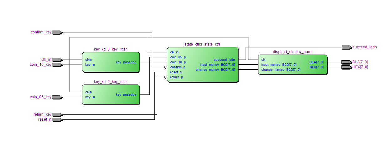 module auto_sell( input clk_in,//时钟 input reset_n,//复位 input coin_10_key,//投币1.0元 input coin_05_key,//投币0.5元 input confirm_key,//确认 input return_key,//退币 output succeed_ledn, output [7:0] DLA,//数码管位选,低电平选择 output [7:0] HEX//数码管段选,低亮 ); wire [7:0] input_money_BCD;//投币金额 wire [7:0] change_money_BCD;//找钱 wire coin_10_p;//投币1.0元 wire coin_05_p;//投币0.5元 //按键上升沿检测模块 key_xd i0_key_jitter( . clkin(clk_in), . key_in(coin_10_key),//输入 . key_posedge(coin_10_p)//按键上升沿检测 ); //按键上升沿检测模块 key_xd i2_key_jitter( . clkin(clk_in), . key_in(coin_05_key),//输入 . key_posedge(coin_05_p)//按键上升沿检测 ); //状态控制模块 state_ctrl i_state_ctrl( . clk_in(clk_in),//时钟100Hz . reset_n(reset_n),//系统复位 . coin_10_p(coin_10_p),//投币1.0元 . coin_05_p(coin_05_p),//投币0.5元 . return_p(~return_key),//退币键 . confirm_p(~confirm_key),//确认 . succeed_ledn(succeed_ledn), . input_money_BCD(input_money_BCD),//投币金额 . change_money_BCD(change_money_BCD)//找钱 );