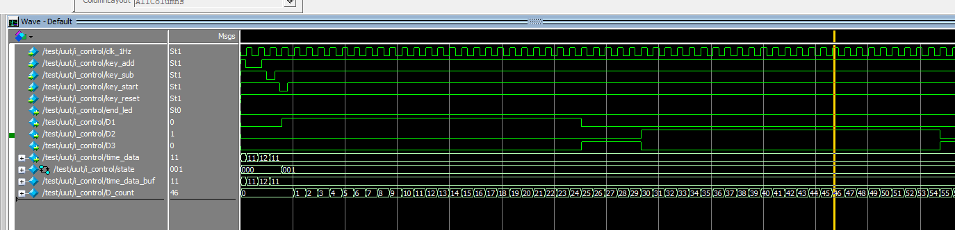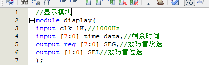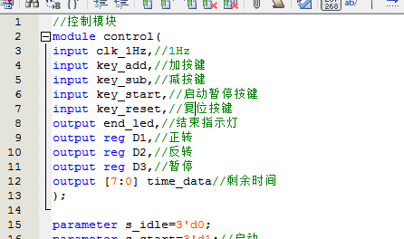 //控制模块 module control( input clk_1Hz,//1Hz input key_add,//加按键 input key_sub,//减按键 input key_start,//启动暂停按键 input key_reset,//复位按键 output end_led,//结束指示灯 output reg D1,//正转 output reg D2,//反转 output reg D3,//暂停 output [7:0] time_data//剩余时间 ); parameter s_idle=3'd0; parameter s_start=3'd1;//启动 parameter s_suspend=3'd2;//暂停 parameter s_end=3'd3;//停止 reg [2:0] state=s_idle; reg [7:0] time_data_buf=8'd10;//剩余时间 always@(posedge clk_1Hz or negedge key_reset) if(~key_reset)//复位按键,按下高电平 state<=s_idle; else case(state)//空闲,设置定时时间 s_idle: if(key_start==0)//启动 state<=s_start;//启动 else state<=s_idle; s_start: if(key_start==0)//暂停 state<=s_suspend;//暂停 else if(time_data_buf==8'd0)//计时结束 state<=s_end; else state<=s_start; s_suspend: if(key_start==0)//启动 state<=s_start;//启动 else state<=s_suspend; s_end: state<=s_end; default:; endcase
