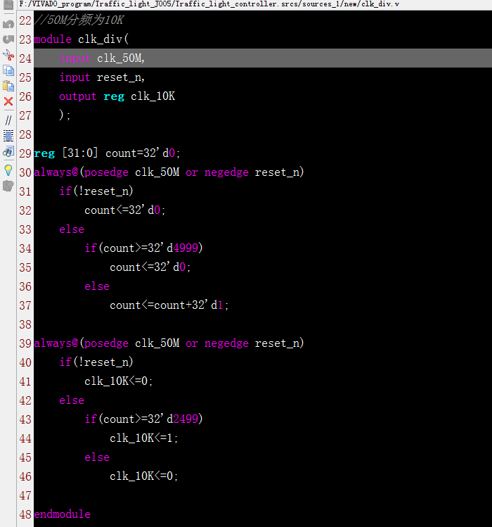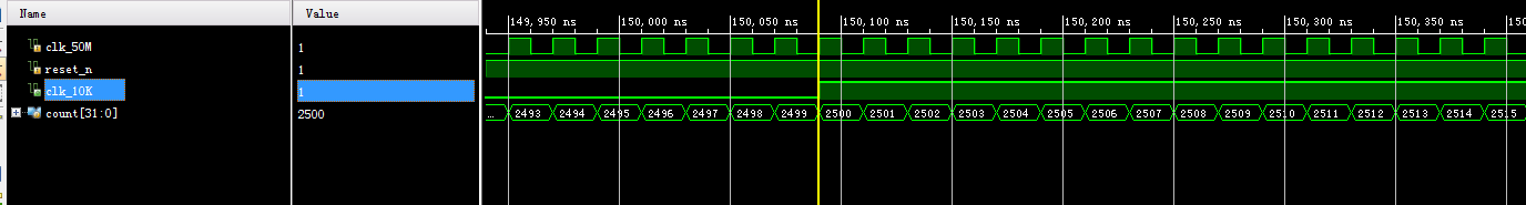 `timescale 1ns / 1ps ////////////////////////////////////////////////////////////////////////////////// // Company: // Engineer: // // Create Date: 2019/08/13 22:53:09 // Design Name: // Module Name: clk_div // Project Name: // Target Devices: // Tool Versions: // Description: // // Dependencies: // // Revision: // Revision 0.01 - File Created // Additional Comments: // ////////////////////////////////////////////////////////////////////////////////// //50M分频为10K module clk_div( input clk_50M, input reset_n, output reg clk_10K ); reg [31:0] count=32'd0; always@(posedge clk_50M or negedge reset_n) if(!reset_n) count<=32'd0; else if(count>=32'd4999) count<=32'd0; else count<=count+32'd1; always@(posedge clk_50M or negedge reset_n) if(!reset_n) clk_10K<=0; else if(count>=32'd2499) clk_10K<=1; else clk_10K<=0; endmodule
