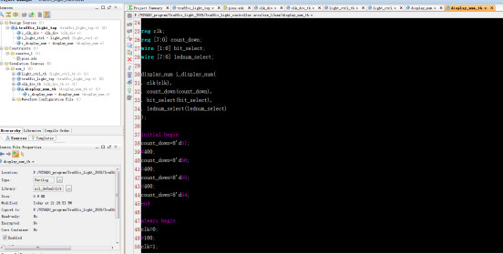 系统要实现交通灯的变化控制和倒计时显示,系数可以分为三个模块设计:时钟分频模块、交通灯控制模块、数码管显示模块。