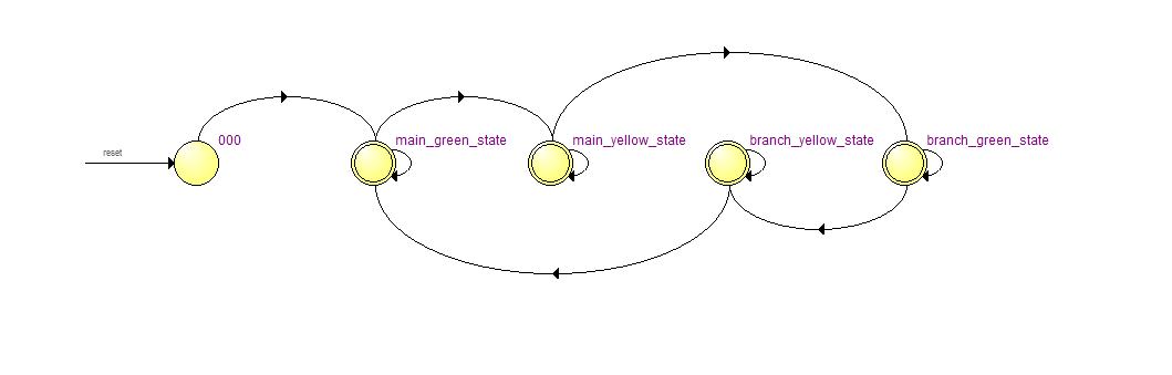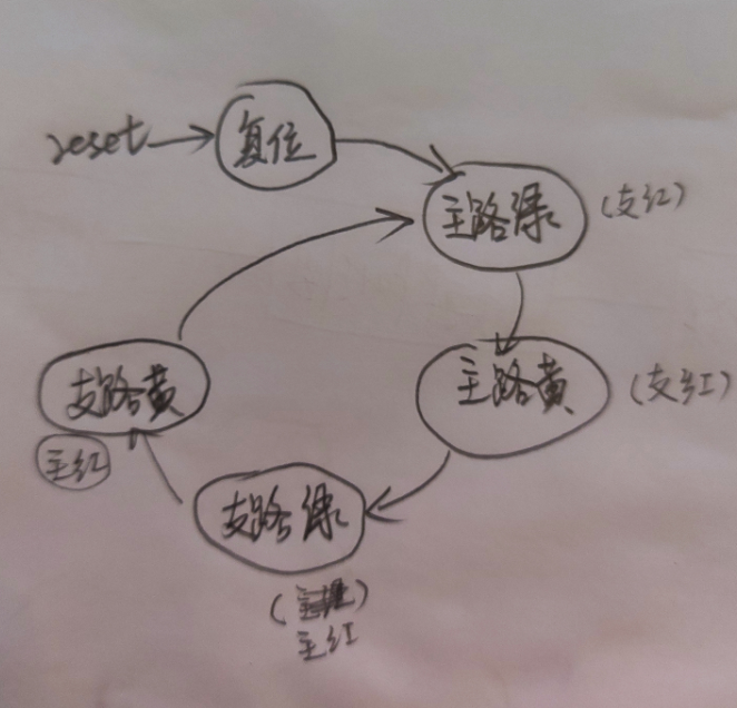 状态分为复位状态,主路绿灯状态,主路黄灯状态,支路绿灯状态,支路黄灯状态。当按下复位复位按键时状态机进入复位状态,然后自动进入主路绿灯状态,在该状态下,主路绿灯亮,支路红灯亮。经过55秒后,进入主路黄灯状态,在该状态下,主路黄灯亮,支路红灯亮。经过10秒后,进入支路绿灯状态,在该状态下,主路红灯亮,支路绿灯亮。经过25秒后,进入支路黄灯状态,在该状态下,主路红灯亮,支路黄灯亮。经过10秒后,进入主路绿灯状态,在该状态下,主路绿灯亮,支路红灯亮。