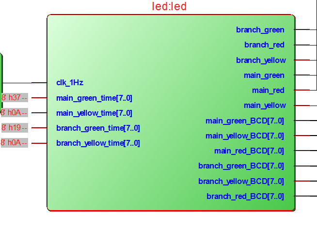 输入clk_1Hz为分频模块输出的1Hz时钟,输入main_green_time、main_yellow_time、branch_green_time、branch_yellow_time分别表示主路绿灯时间(8’h37为十六进制,对应十进制的55)、主路黄灯时间、支路绿灯时间、支路黄灯时间。