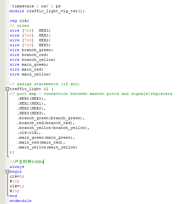 顶层端口输入为50MHz时钟,输出main_red、main_green、main_yellow分别表示主路红、绿、黄灯。branch_red、branch_green、branch_yellow分别表示支路红、绿、黄灯。输出HEX0为支路倒计时个位,HEX1为支路倒计时十位,输出HEX2为主路倒计时个位,HEX3为主路倒计时十位。