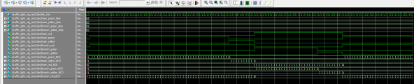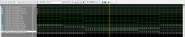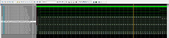 输出main_red、main_green、main_yellow分别表示主路红、绿、黄灯。branch_red、branch_green、branch_yellow分别表示支路红、绿、黄灯。输出main_green_BCD、main_yellow_BCD、main_red_BCD分别表示主路绿灯正计数、主路黄灯正计数、主路红灯正计数。branch_green_BCD、branch_yellow_BCD、branch_red_BCD分别表示支路绿灯正计数、支路黄灯正计数、支路红灯正计数。图中可以看到主路主路红绿灯切换正确,时长正确。因此交通灯控制模块功能验证正确。