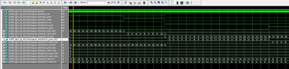 顶层端口输入为50MHz时钟,输出main_red、main_green、main_yellow分别表示主路红、绿、黄灯。branch_red、branch_green、branch_yellow分别表示支路红、绿、黄灯。可以清楚看到倒计时计数正确,对应的红绿灯也正确。数码管显示图中当SMG_1=54时,表示主路倒计时为54,即需要HEX2显示4,HEX3显示5,4对应的数码管译码值为10011001,5对应的数码管译码值为10010010,整体仿真正确。