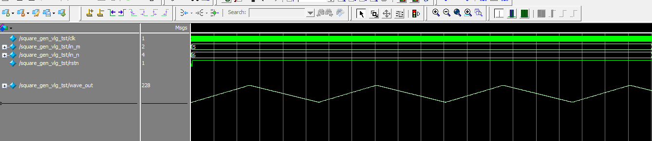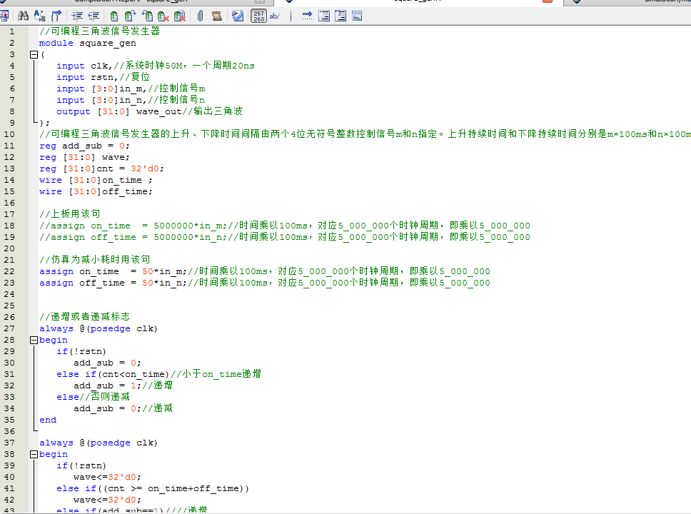 //可编程三角波信号发生器 module square_gen ( input clk,//系统时钟50M,一个周期20ns input rstn,//复位 input [3:0]in_m,//控制信号m input [3:0]in_n,//控制信号n output [31:0] wave_out//输出三角波 ); //可编程三角波信号发生器的上升、下降时间间隔由两个4位无符号整数控制信号m和n指定。上升持续时间和下降持续时间分别是m×100ms和n×100ms。 reg add_sub = 0; reg [31:0] wave; reg [31:0]cnt = 32'd0; wire [31:0]on_time ; wire [31:0]off_time; //上板用该句 //assign on_time = 5000000*in_m;//时间乘以100ms,对应5_000_000个时钟周期,即乘以5_000_000 //assign off_time = 5000000*in_n;//时间乘以100ms,对应5_000_000个时钟周期,即乘以5_000_000 //仿真为减小耗时用该句 assign on_time = 50*in_m;//时间乘以100ms,对应5_000_000个时钟周期,即乘以5_000_000 assign off_time = 50*in_n;//时间乘以100ms,对应5_000_000个时钟周期,即乘以5_000_000 //递增或者递减标志 always @(posedge clk) begin if(!rstn) add_sub = 0; else if(cnt<on_time)//小于on_time递增 add_sub = 1;//递增 else//否则递减 add_sub = 0;//递减 end always @(posedge clk) begin if(!rstn) wave<=32'd0; else if((cnt >= on_time+off_time)) wave<=32'd0; else if(add_sub==1)////递增 wave<=wave+in_n;//上升 else if(wave>=in_m) wave<=wave-in_m;//下降 end