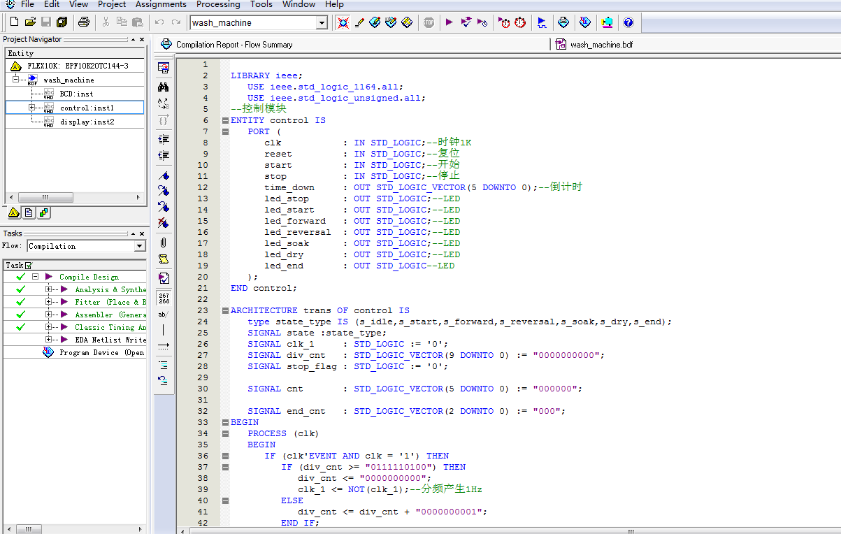 洗衣机控制器设计VHDL代码Quartus EPF10K开发板