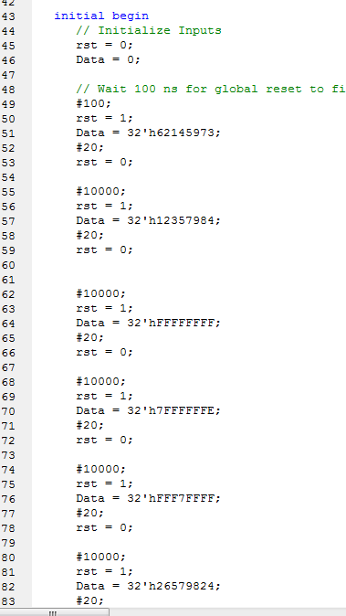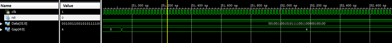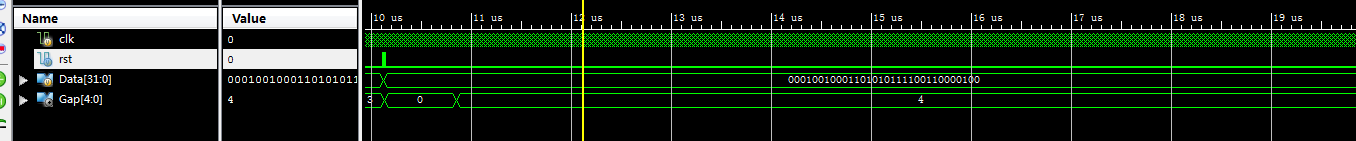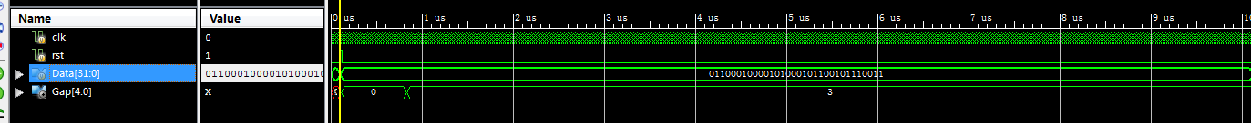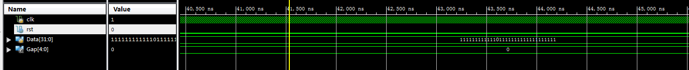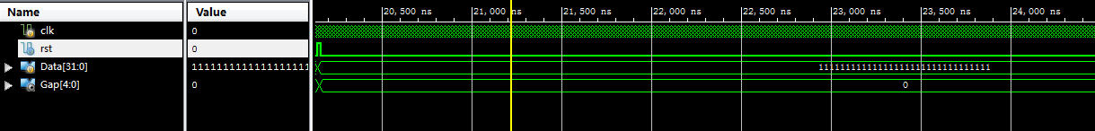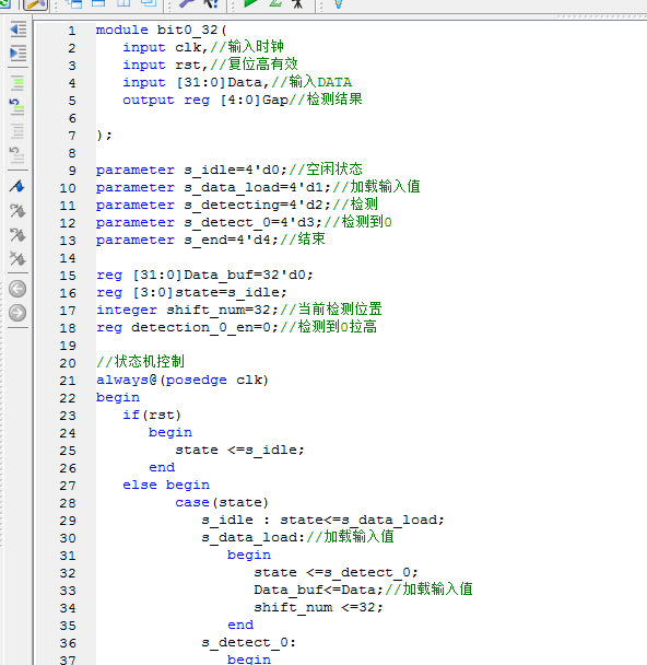 module bit0_32( input clk,//输入时钟 input rst,//复位高有效 input [31:0]Data,//输入DATA output reg [4:0]Gap//检测结果 ); parameter s_idle=4'd0;//空闲状态 parameter s_data_load=4'd1;//加载输入值 parameter s_detecting=4'd2;//检测 parameter s_detect_0=4'd3;//检测到0 parameter s_end=4'd4;//结束 reg [31:0]Data_buf=32'd0; reg [3:0]state=s_idle; integer shift_num=32;//当前检测位置 reg detection_0_en=0;//检测到0拉高 //状态机控制 always@(posedge clk) begin if(rst) begin state <=s_idle; end else begin case(state) s_idle : state<=s_data_load; s_data_load://加载输入值 begin state <=s_detect_0; Data_buf<=Data;//加载输入值 shift_num <=32; end s_detect_0: begin shift_num<=shift_num-1; if(shift_num==0)//判断是否检测完毕 begin state<=s_end;//结束 end else begin if(Data_buf[shift_num-1]==0)//检测当前位是不是0 begin state <=s_detecting; end