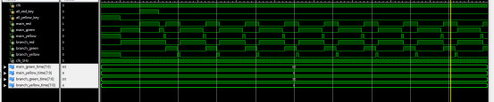 `timescale 1ns / 1ps module test_bench; // Inputs reg clk; reg all_red_key;//全红控制按键 reg all_yellow_key;//全黄控制按键 // Outputs wire main_red; wire main_green; wire main_yellow; wire branch_red; wire branch_green; wire branch_yellow; // Instantiate the Unit Under Test (UUT) traffic_light uut ( .clk(clk), .all_red_key(all_red_key), .all_yellow_key(all_yellow_key), .main_red(main_red), .main_green(main_green), .main_yellow(main_yellow), .branch_red(branch_red), .branch_green(branch_green), .branch_yellow(branch_yellow) ); always begin clk=0; #10; clk=1; #10; end