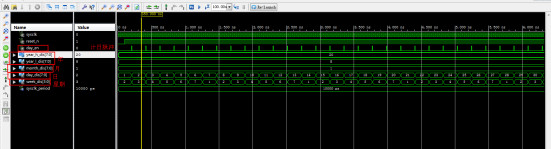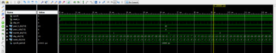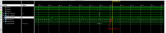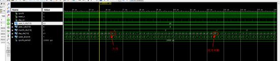 LIBRARY ieee; USE ieee.std_logic_1164.all; USE ieee.std_logic_unsigned.all; use ieee.std_logic_arith.all; ENTITY calendar IS PORT ( sysclk : IN STD_LOGIC;--时钟 reset_n : IN STD_LOGIC;--复位--k1 day_en : IN STD_LOGIC;--计日脉冲 year_h_dis : OUT STD_LOGIC_VECTOR(7 DOWNTO 0);--年高2位 year_l_dis : OUT STD_LOGIC_VECTOR(7 DOWNTO 0);--年低2位 month_dis : OUT STD_LOGIC_VECTOR(7 DOWNTO 0);--月 day_dis : OUT STD_LOGIC_VECTOR(7 DOWNTO 0);--日 week_dis : OUT STD_LOGIC_VECTOR(3 DOWNTO 0)--星期 ); END calendar; ARCHITECTURE RTL OF calendar IS SIGNAL year_h : STD_LOGIC_VECTOR(7 DOWNTO 0) := "00010100"; SIGNAL year_l : STD_LOGIC_VECTOR(7 DOWNTO 0) := "00001000"; SIGNAL month : STD_LOGIC_VECTOR(3 DOWNTO 0) := "0001"; SIGNAL day : STD_LOGIC_VECTOR(4 DOWNTO 0) := "11110"; SIGNAL week : STD_LOGIC_VECTOR(3 DOWNTO 0) := "0001"; SIGNAL month_flag : STD_LOGIC; BEGIN year_h_dis <= year_h; year_l_dis <= year_l; month_dis <="0000" & month; day_dis <="000" & day; week_dis <= week; -- month_flag <= std_logic((day = "11100") AND NOT((year_l(1 DOWNTO 0) = "00" AND year_l /= "00000000" OR year_h(1 DOWNTO 0) = "00" AND year_l = "00000000")) AND (month = "0010") --OR (day = "11101") AND (year_l(1 DOWNTO 0) = "00" AND year_l /= "00000000" OR year_h(1 DOWNTO 0) = "00" AND year_l = "00000000") AND (month = "0010") --OR (day = "11110") AND ((month = "0100") OR (month = "0110") OR (month = "1001") OR (month = "1011")) --OR (day = "11111") AND ((month = "0001") OR (month = "0011") OR (month = "0101") OR (month = "0111") OR (month = "1000") OR (month = "1010") OR (month = "1100"))); --闰月判断 PROCESS (day, month , year_l, year_h) BEGIN IF ((day = "11100") AND NOT(((year_l(1 DOWNTO 0) = "00" AND year_l /= "00000000") OR (year_h(1 DOWNTO 0) = "00" AND year_l = "00000000"))) AND (month = "0010")) THEN month_flag<='1'; ELSIF((day = "11101") AND ((year_l(1 DOWNTO 0) = "00" AND year_l /= "00000000") OR (year_h(1 DOWNTO 0) = "00" AND year_l = "00000000")) AND (month = "0010"))THEN month_flag<='1'; ELSIF((day = "11110") AND ((month = "0100") OR (month = "0110") OR (month = "1001") OR (month = "1011")) )THEN month_flag<='1'; ELSIF((day = "11111") AND ((month = "0001") OR (month = "0011") OR (month = "0101") OR (month = "0111") OR (month = "1000") OR (month = "1010") OR (month = "1100")))THEN month_flag<='1'; ELSE month_flag<='0'; END IF; END PROCESS;