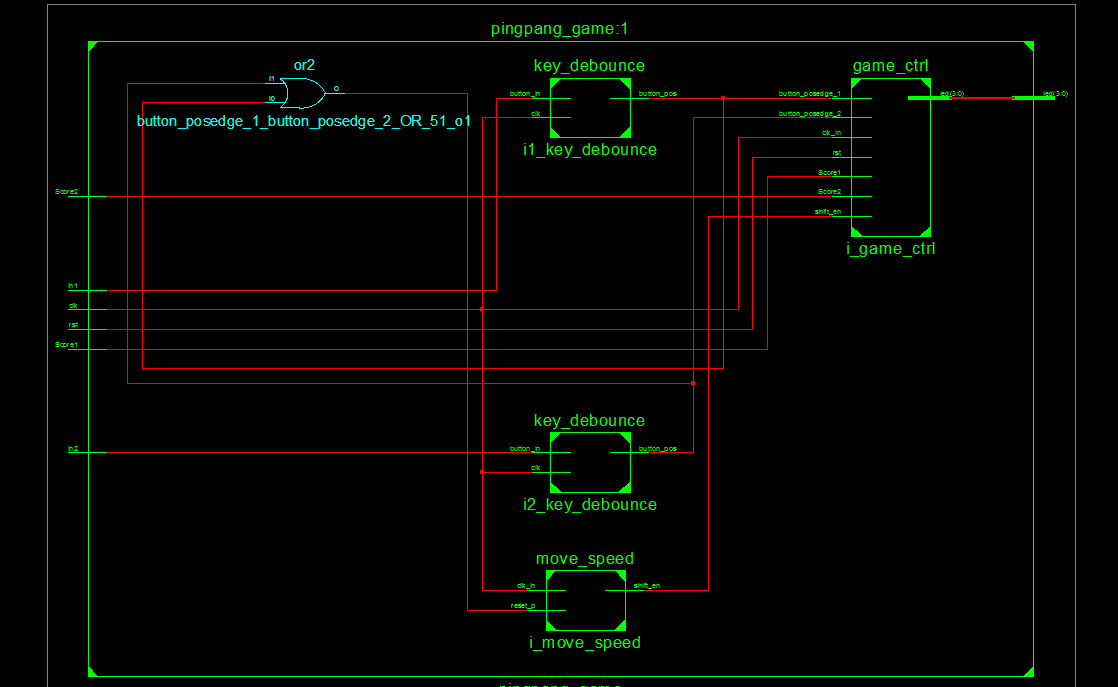 ①clk为系统时钟,在代码中需要进行分频,根据合适的分频系数从而调节乒乓球的运动快慢;rst为异步复位信号,可清除当前的比分;inl和in2分别为两个选手的击球按钮。 scorel和sore2分别为显示各自当前分数的按键,当按下任意一个时,led[3:0]显示相对应选手的分数