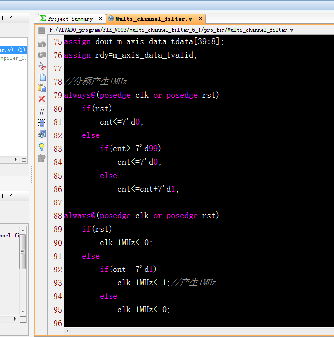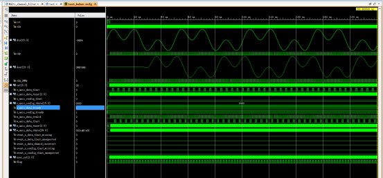 `timescale 1ns / 1ps ////////////////////////////////////////////////////////////////////////////////// // Company: // Engineer: // // Create Date: 2020/09/30 05:04:08 // Design Name: // Module Name: Multi_channel_filter // Project Name: // Target Devices: // Tool Versions: // Description: // // Dependencies: // // Revision: // Revision 0.01 - File Created // Additional Comments: // ////////////////////////////////////////////////////////////////////////////////// module Multi_channel_filter( rst,clk,din, rdy,dout); inputrst; //复位信号,高电平有效 inputclk; //FPGA系统时钟,频率为100MHz input signed [15:0]din; //数据输入频率为HZ output rdy; //输出数据有效指示信号 output signed [31:0]dout; //滤波后的输出数据 reg clk_1MHz; reg [6:0] cnt=7'd0; reg s_axis_data_tlast=0; wire [2 : 0] s_axis_data_tuser; reg s_axis_config_tlast=0; reg [15 : 0] s_axis_config_tdata=16'd0; wire s_axis_data_tready; wire s_axis_config_tready; wire m_axis_data_tvalid; wire m_axis_data_tlast; wire [2 : 0] m_axis_data_tuser; wire [39 : 0] m_axis_data_tdata; wire event_s_data_tlast_missing; wire event_s_data_tlast_unexpected; wire event_s_data_chanid_incorrect; wire event_s_config_tlast_missing; wire event_s_config_tlast_unexpected; //调用IP核 fir_compiler_0 i_fir_compiler_0 ( .aclk(clk), // input wire aclk .s_axis_data_tvalid(clk_1MHz), // input wire s_axis_data_tvalid .s_axis_data_tready(s_axis_data_tready), // output wire s_axis_data_tready .s_axis_data_tlast(s_axis_data_tlast), // input wire s_axis_data_tlast .s_axis_data_tuser(s_axis_data_tuser), // input wire [2 : 0] s_axis_data_tuser .s_axis_data_tdata(din), // input wire [15 : 0] s_axis_data_tdata .s_axis_config_tvalid(1'b0), // input wire s_axis_config_tvalid .s_axis_config_tready(s_axis_config_tready), // output wire s_axis_config_tready .s_axis_config_tlast(s_axis_config_tlast), // input wire s_axis_config_tlast .s_axis_config_tdata(s_axis_config_tdata), // input wire [15 : 0] s_axis_config_tdata .m_axis_data_tvalid(m_axis_data_tvalid), // output wire m_axis_data_tvalid .m_axis_data_tlast(m_axis_data_tlast),