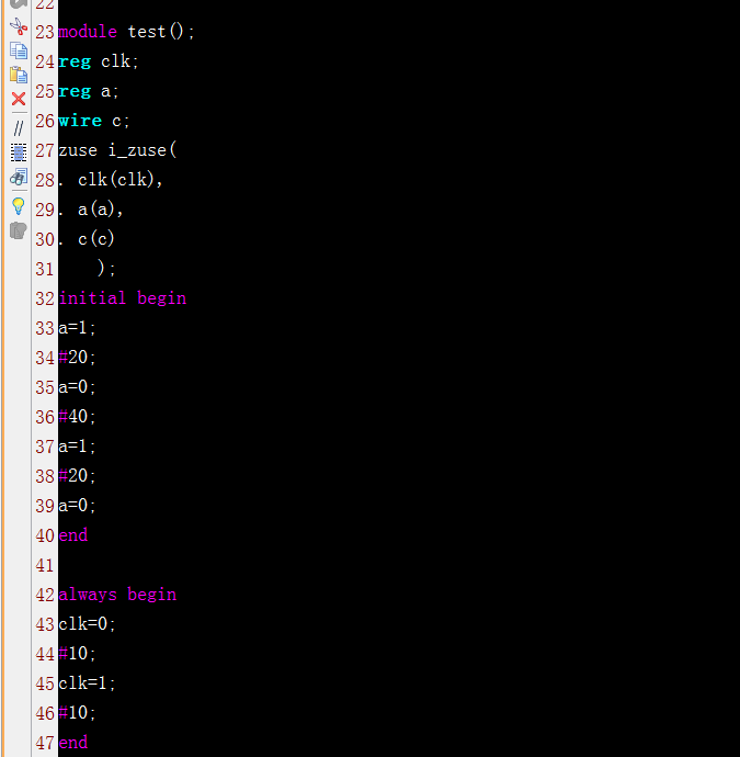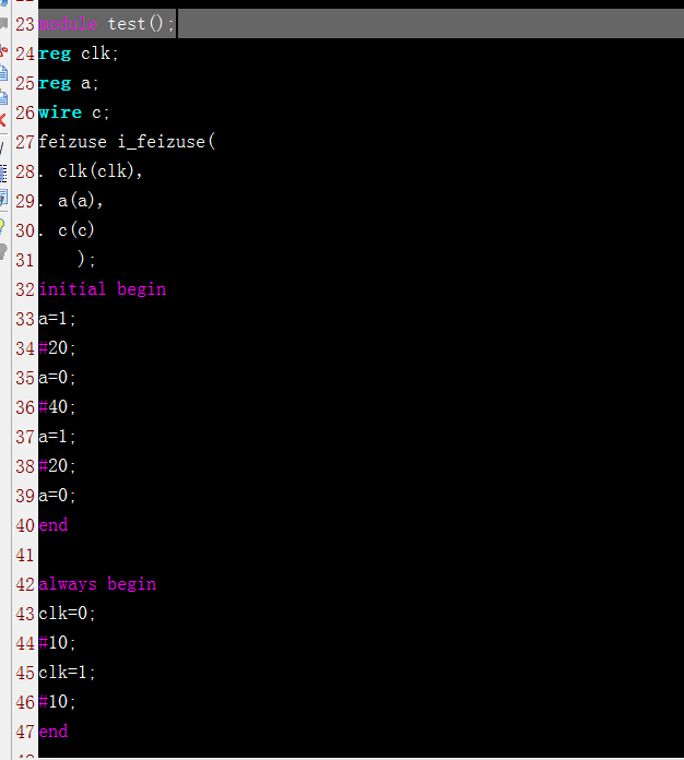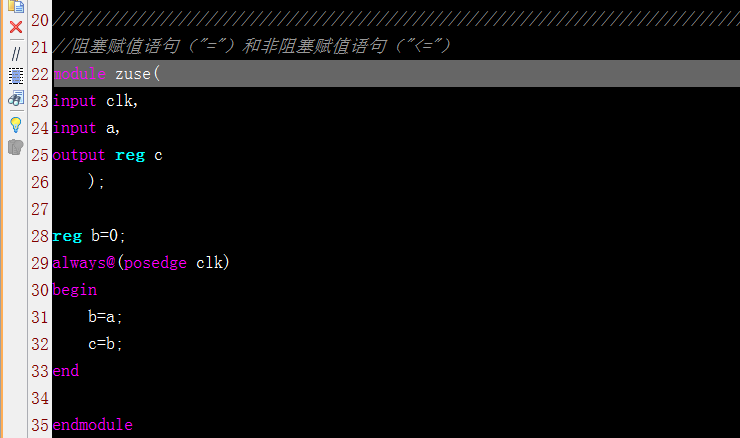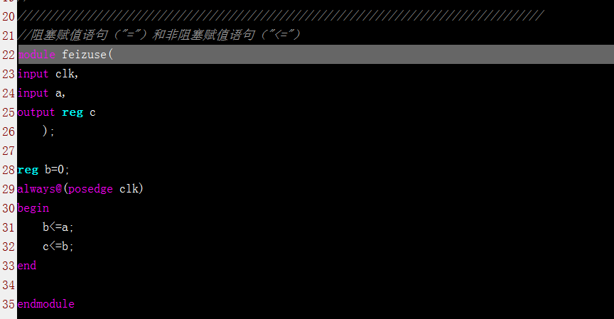 `timescale 1ns / 1ps ////////////////////////////////////////////////////////////////////////////////// // Company: // Engineer: // // Create Date: 2019/11/13 23:52:44 // Design Name: // Module Name: feizuse // Project Name: // Target Devices: // Tool Versions: // Description: // // Dependencies: // // Revision: // Revision 0.01 - File Created // Additional Comments: // ////////////////////////////////////////////////////////////////////////////////// //阻塞赋值语句("=")和非阻塞赋值语句("<=") module feizuse( input clk, input a, output reg c