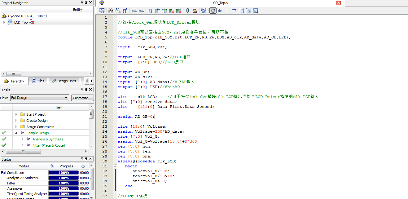 基于TLC5510的电压表及LCD1602显示设计Verilog代码Quartus 大西瓜开发板