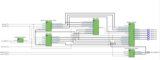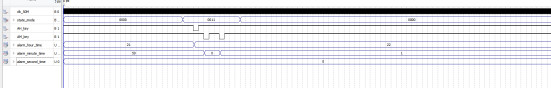 //设置闹钟模块 module alarm_clock( input clk_50M, input [3:0] state_mode,////当前模式,4'd0:计时,4'd1设置时间 ,4'd2显示闹钟时间,4'd3设置闹钟时间 input AH_key,//AH 修改小时 input AM_key,//AM 修改分钟 output [7:0] alarm_hour_time,//时 output [7:0] alarm_minute_time,//分 output [7:0] alarm_second_time//秒 ); wire AH_key_negedge; wire AM_key_negedge; reg AH_key_buf0; reg AH_key_buf1; reg AM_key_buf0; reg AM_key_buf1; always@(posedge clk_50M) begin AH_key_buf0<=AH_key; AH_key_buf1<=AH_key_buf0; end always@(posedge clk_50M) begin AM_key_buf0<=AM_key; AM_key_buf1<=AM_key_buf0; end assign AH_key_negedge=~AH_key_buf0 & AH_key_buf1;//按键下降沿 assign AM_key_negedge=~AM_key_buf0 & AM_key_buf1;//按键下降沿 reg [7:0] hour=8'd21;//时 reg [7:0] minute=8'd59;//分 reg [7:0] second=8'd00;//秒