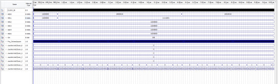 LIBRARY ieee; USE ieee.std_logic_1164.all; USE ieee.std_logic_unsigned.all; --计数器模块 ENTITY counter IS PORT ( signal_in : IN STD_LOGIC;--被测信号 en : IN STD_LOGIC;--1S闸门信号 rst : IN STD_LOGIC; number : OUT STD_LOGIC_VECTOR(31 DOWNTO 0)--频率值 ); END counter; ARCHITECTURE behavioral OF counter IS SIGNAL num_0 : STD_LOGIC_VECTOR(3 DOWNTO 0) := "0000"; SIGNAL num_1 : STD_LOGIC_VECTOR(3 DOWNTO 0) := "0000"; SIGNAL num_2 : STD_LOGIC_VECTOR(3 DOWNTO 0) := "0000"; SIGNAL num_3 : STD_LOGIC_VECTOR(3 DOWNTO 0) := "0000"; SIGNAL num_4 : STD_LOGIC_VECTOR(3 DOWNTO 0) := "0000"; SIGNAL num_5 : STD_LOGIC_VECTOR(3 DOWNTO 0) := "0000"; SIGNAL num_6 : STD_LOGIC_VECTOR(3 DOWNTO 0) := "0000"; SIGNAL num_7 : STD_LOGIC_VECTOR(3 DOWNTO 0) := "0000"; BEGIN number <= (num_7 & num_6 & num_5 & num_4 & num_3 & num_2 & num_1 & num_0);--单位Hz --计数,计数1s内的信号周期数,计数值就是频率值 PROCESS (signal_in, rst) BEGIN IF (rst = '1') THEN num_0 <= "0000"; num_1 <= "0000"; num_2 <= "0000"; num_3 <= "0000"; num_4 <= "0000"; num_5 <= "0000"; num_6 <= "0000"; num_7 <= "0000"; ELSIF (signal_in'EVENT AND signal_in = '1') THEN IF (en = '1') THEN--计数,低位都是9,则高位加1,低位清零,例如加到9999,则变为10000 IF (num_6 = "1001" AND num_5 = "1001" AND num_4 = "1001" AND num_3 = "1001" AND num_2 = "1001" AND num_1 = "1001" AND num_0 = "1001") THEN num_0 <= "0000"; num_1 <= "0000"; num_2 <= "0000"; num_3 <= "0000"; num_4 <= "0000"; num_5 <= "0000"; num_6 <= "0000"; num_7 <= num_7 + "0001";--低位为9,则高位加1,低位清零 ELSIF (num_5 = "1001" AND num_4 = "1001" AND num_3 = "1001" AND num_2 = "1001" AND num_1 = "1001" AND num_0 = "1001") THEN num_0 <= "0000"; num_1 <= "0000"; num_2 <= "0000"; num_3 <= "0000"; num_4 <= "0000"; num_5 <= "0000"; num_6 <= num_6 + "0001";--低位为9,则高位加1,低位清零 num_7 <= num_7; ELSIF (num_4 = "1001" AND num_3 = "1001" AND num_2 = "1001" AND num_1 = "1001" AND num_0 = "1001") THEN num_0 <= "0000"; num_1 <= "0000"; num_2 <= "0000"; num_3 <= "0000"; num_4 <= "0000"; num_5 <= num_5 + "0001";--低位为9,则高位加1,低位清零 num_6 <= num_6; num_7 <= num_7; ELSIF (num_3 = "1001" AND num_2 = "1001" AND num_1 = "1001" AND num_0 = "1001") THEN num_0 <= "0000"; num_1 <= "0000"; num_2 <= "0000"; num_3 <= "0000"; num_4 <= num_4 + "0001";--低位为9,则高位加1,低位清零 num_5 <= num_5; num_6 <= num_6; num_7 <= num_7; ELSIF (num_2 = "1001" AND num_1 = "1001" AND num_0 = "1001") THEN num_0 <= "0000"; num_1 <= "0000"; num_2 <= "0000"; num_3 <= num_3 + "0001";--低位为9,则高位加1,低位清零 num_4 <= num_4; num_5 <= num_5; num_6 <= num_6; num_7 <= num_7; ELSIF (num_1 = "1001" AND num_0 = "1001") THEN num_0 <= "0000"; num_1 <= "0000"; num_2 <= num_2 + "0001";--低位为9,则高位加1,低位清零 num_3 <= num_3; num_4 <= num_4; num_5 <= num_5; num_6 <= num_6; num_7 <= num_7; ELSIF (num_0 = "1001") THEN
