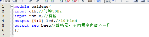 module caideng( input clk,//时钟50Hz input rst_n,//复位 output [9:0] led,//10个led output reg beep//蜂鸣器,不同频率声音不一样 ); //led彩灯 //4种模式 //分频到1Hz reg [7:0] div_cnt; always@(posedge clk or negedge rst_n) if(!rst_n) div_cnt<=8'd0; else if(div_cnt==8'd49)//计数,分频到1Hz div_cnt<=8'd0; else div_cnt<=div_cnt+8'd1;//累加 reg clk_1Hz; always@(posedge clk or negedge rst_n) if(!rst_n) clk_1Hz<=1'd0; else if(div_cnt==8'd49)//分频到1Hz clk_1Hz<=1'd1; else clk_1Hz<=1'd0; reg [7:0] led_cnt;//led变化计数 always@(posedge clk_1Hz or negedge rst_n) if(!rst_n) led_cnt<=8'd0; else if(led_cnt==8'd20)//计数到20 led_cnt<=8'd0; else led_cnt<=led_cnt+8'd1;//led变化计数 reg [9:0] led_buf; always@(posedge clk or negedge rst_n) if(!rst_n) led_buf<=10'b0000000000; else case(led_cnt) 8'd0 :led_buf<=10'b0000000000;//不亮 //模式1,奇数亮 8'd1 :led_buf<=10'b0000000001; 8'd2 :led_buf<=10'b0000000100; 8'd3 :led_buf<=10'b0000010000; 8'd4 :led_buf<=10'b0001000000; 8'd5 :led_buf<=10'b0100000000; //模式2,偶数亮 8'd6 :led_buf<=10'b0000000010; 8'd7 :led_buf<=10'b0000001000; 8'd8 :led_buf<=10'b0000100000; 8'd9 :led_buf<=10'b0010000000; 8'd10:led_buf<=10'b1000000000; //模式3,连续2个亮 8'd11:led_buf<=10'b0000000011; 8'd12:led_buf<=10'b0000001100; 8'd13:led_buf<=10'b0000110000; 8'd14:led_buf<=10'b0011000000; 8'd15:led_buf<=10'b1100000000; //模式4,交叉亮 8'd16:led_buf<=10'b1000000001; 8'd17:led_buf<=10'b0100000010; 8'd18:led_buf<=10'b0010000100; 8'd19:led_buf<=10'b0001001000; 8'd20:led_buf<=10'b0000110000; default:; endcase