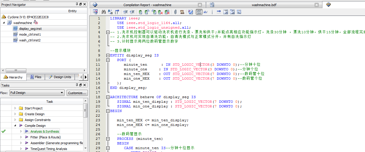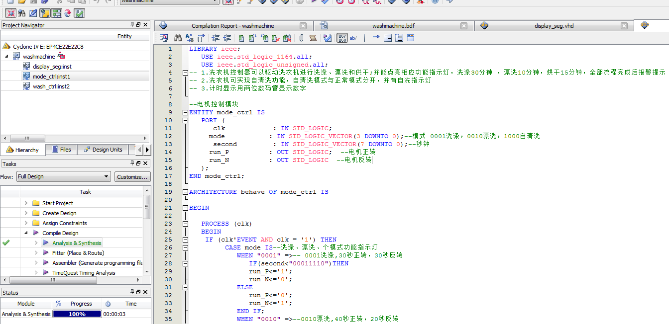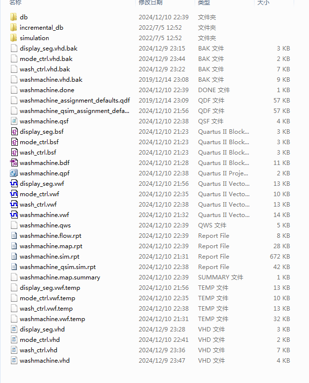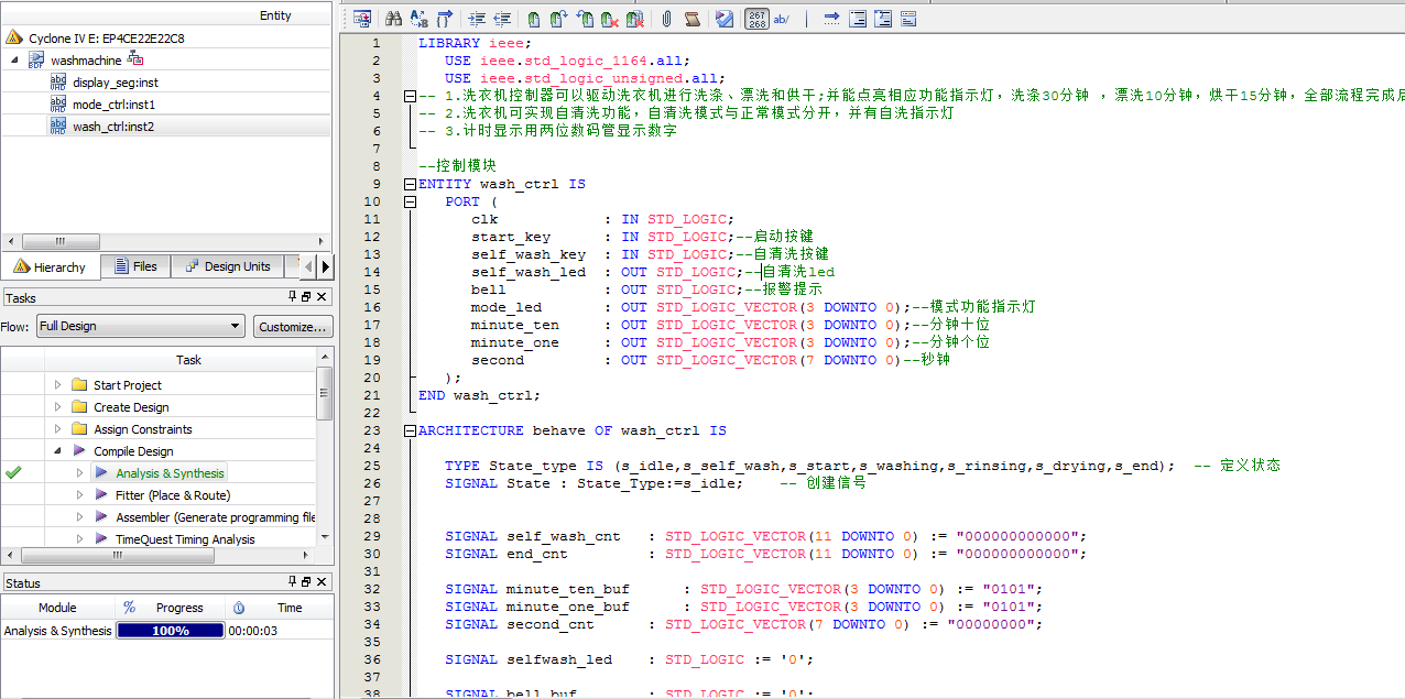名称:洗衣机控制器设计VHDL代码Quartus仿真