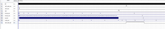 LIBRARY ieee; USE ieee.std_logic_1164.all; USE ieee.std_logic_unsigned.all; -- 1.洗衣机控制器可以驱动洗衣机进行洗涤、漂洗和供干;并能点亮相应功能指示灯,洗涤30分钟 ,漂洗10分钟,烘干15分钟,全部流程完成后报警提示 -- 2.洗衣机可实现自清洗功能,自清洗模式与正常模式分开,并有自洗指示灯 -- 3.计时显示用两位数码管显示数字 --控制模块 ENTITY wash_ctrl IS PORT ( clk : IN STD_LOGIC; start_key : IN STD_LOGIC;--启动按键 self_wash_key : IN STD_LOGIC;--自清洗按键 self_wash_led : OUT STD_LOGIC;--自清洗led bell : OUT STD_LOGIC;--报警提示 mode_led : OUT STD_LOGIC_VECTOR(3 DOWNTO 0);--模式功能指示灯 minute_ten : OUT STD_LOGIC_VECTOR(3 DOWNTO 0);--分钟十位 minute_one : OUT STD_LOGIC_VECTOR(3 DOWNTO 0);--分钟个位 second : OUT STD_LOGIC_VECTOR(7 DOWNTO 0)--秒钟 ); END wash_ctrl; ARCHITECTURE behave OF wash_ctrl IS TYPE State_type IS (s_idle,s_self_wash,s_start,s_washing,s_rinsing,s_drying,s_end); -- 定义状态 SIGNAL State : State_Type:=s_idle; -- 创建信号 SIGNAL self_wash_cnt : STD_LOGIC_VECTOR(11 DOWNTO 0) := "000000000000"; SIGNAL end_cnt : STD_LOGIC_VECTOR(11 DOWNTO 0) := "000000000000"; SIGNAL minute_ten_buf : STD_LOGIC_VECTOR(3 DOWNTO 0) := "0101"; SIGNAL minute_one_buf : STD_LOGIC_VECTOR(3 DOWNTO 0) := "0101"; SIGNAL second_cnt : STD_LOGIC_VECTOR(7 DOWNTO 0) := "00000000"; SIGNAL selfwash_led : STD_LOGIC := '0'; SIGNAL bell_buf : STD_LOGIC := '0'; SIGNAL mode_led_buf : STD_LOGIC_VECTOR(3 DOWNTO 0) := "0000"; BEGIN minute_ten<= minute_ten_buf; minute_one<= minute_one_buf; second <= second_cnt; --状态机控制