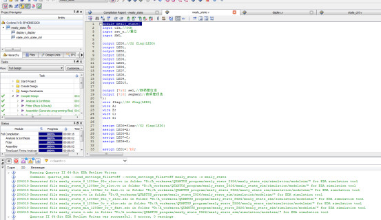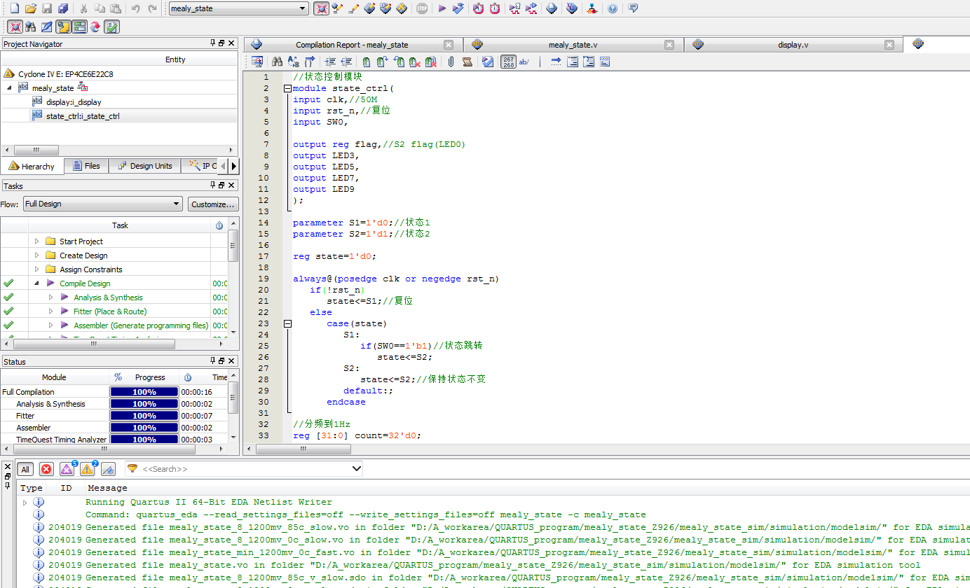l)、使用原理图输入法或 Verilog HDI语言设计一个 Mealy有限状态机,用七段数码管显示输出编码;