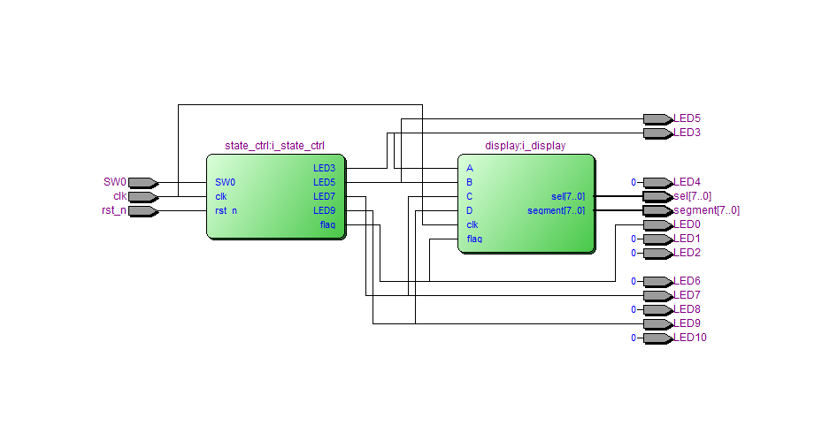 module mealy_state( input clk,//50M input rst_n,//复位 input SW0, output LED0,//S2 flag(LED0) output LED1, output LED2, output LED3, output LED4, output LED5, output LED6, output LED7, output LED8, output LED9, output LED10, output [7:0] sel,//数码管位选 output [7:0] segment//数码管段选 ); wire flag;//S2 flag(LED0) wire A; wire B; wire C; wire D; assign LED0=flag;//S2 flag(LED0) assign LED3=A; assign LED5=B; assign LED7=C; assign LED9=D; assign LED1=1'b0; assign LED2=1'b0; assign LED4=1'b0; assign LED6=1'b0; assign LED8=1'b0; assign LED10=1'b0;
