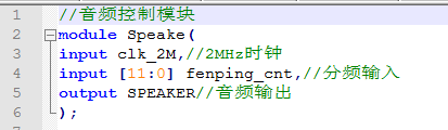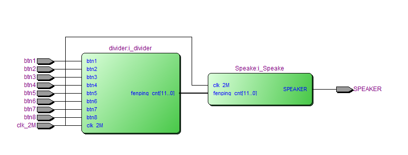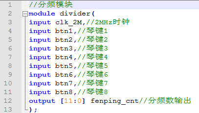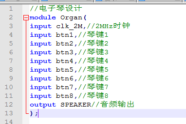 //电子琴设计 module Organ( input clk_2M,//2MHz时钟 input btn1,//琴键1 input btn2,//琴键2 input btn3,//琴键3 input btn4,//琴键4 input btn5,//琴键5 input btn6,//琴键6 input btn7,//琴键7 input btn8,//琴键8 output SPEAKER//音频输出 ); wire [11:0] fenping_cnt;//分频数输出 //分频模块 divider i_divider( . clk_2M(clk_2M),//2MHz时钟 . btn1(btn1),//琴键1 . btn2(btn2),//琴键2 . btn3(btn3),//琴键3 . btn4(btn4),//琴键4 . btn5(btn5),//琴键5 . btn6(btn6),//琴键6 . btn7(btn7),//琴键7 . btn8(btn8),//琴键8 . fenping_cnt(fenping_cnt)//分频数输出 ); //音频控制模块 Speake i_Speake( . clk_2M(clk_2M),//2MHz时钟 . fenping_cnt(fenping_cnt),//分频输入 . SPEAKER(SPEAKER)//音频输出 ); endmodule