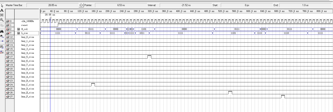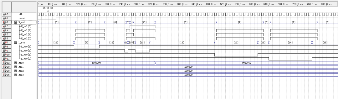 ·键盘扫描:key_4x4 模块以扫描列(H_col)—读取行(L_row)的方式逐行判定,内部使用状态机依次驱动列线并采样行线,定位按键矩阵坐标,输出独热码 key_number(15:0)。