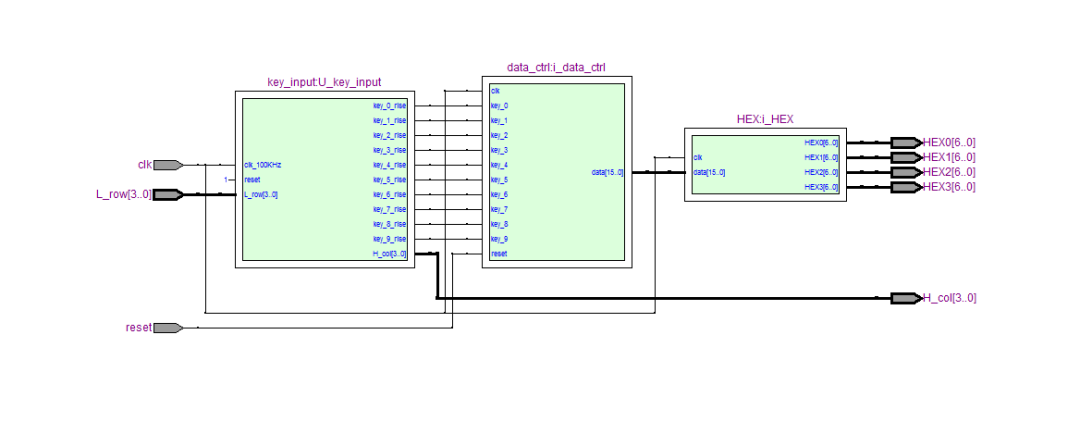 L_row → key_4x4 → key_input →(key_0..key_9 上升沿)→ data_ctrl → data[15:0] → HEX → HEX3..HEX0