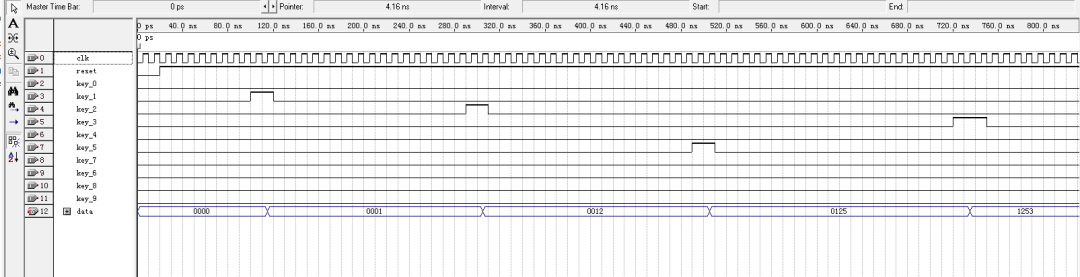 ·数据拼接:data_ctrl 接收 key_0~key_9 的上升沿,每次按键将 16 位寄存器整体左移 4 位,并在低 4 位写入对应 BCD(0000~1001)。复位有效时清零。