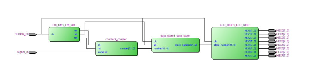 ·显示模块(LED_DISP)将锁存的频率值转换为数码管显示格式,驱动8位数码管显示。 各模块通过信号线连接,协同完成频率测量和显示。整体设计结构清晰,易于扩展和维护。