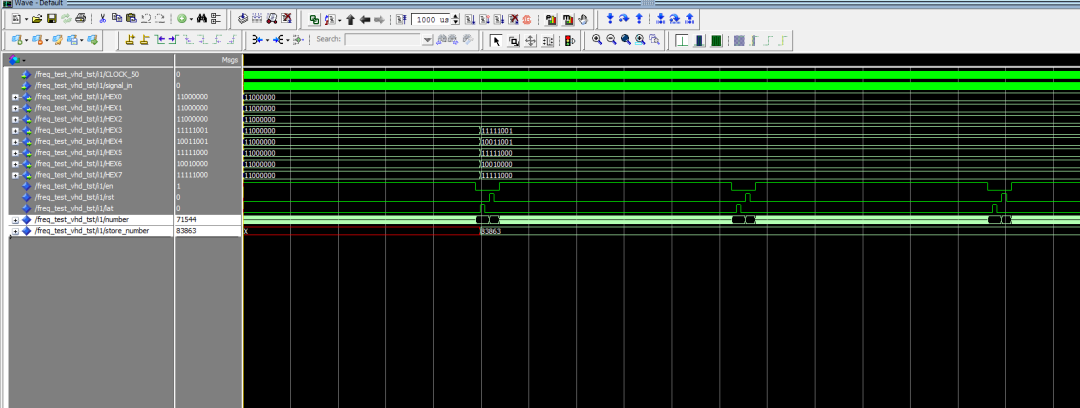 ·锁存模块(data_store)在锁存信号到来时,将计数器输出的频率值锁存。