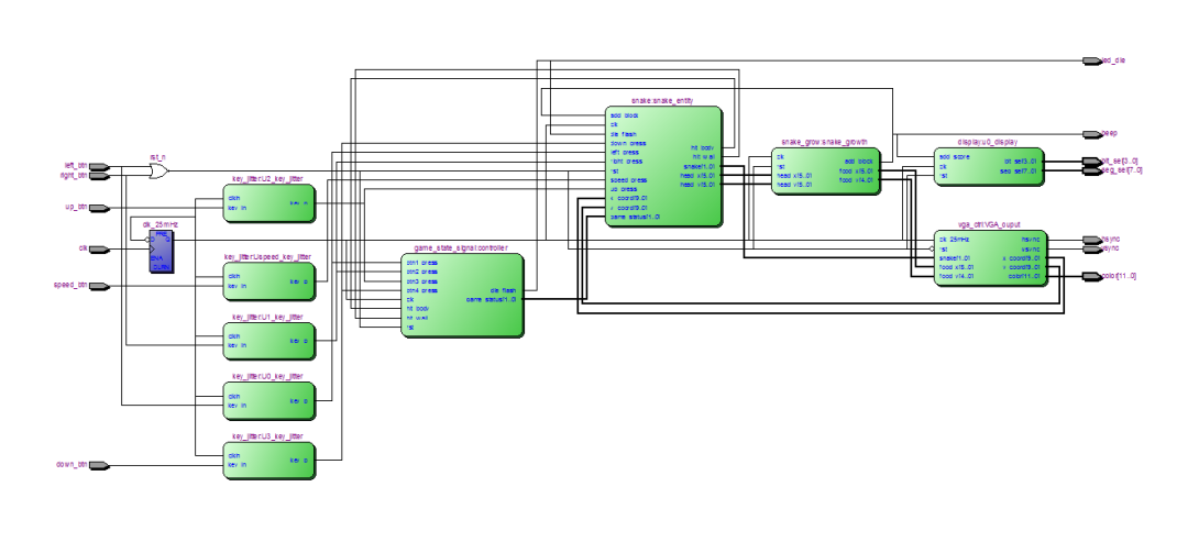 代码实现思路: 整体采用模块化设计,将游戏逻辑、显示控制、按键去抖、得分显示及随机食物生成等功能拆分为独立模块,模块间通过信号总线交互。主控实体 snake_game 负责时钟分频、按键去抖和模块实例化;snake 模块维护蛇身位置数组并实现移动、方向转换、碰撞检测与增长逻辑;snake_grow 采用伪随机数生成食物坐标并在检测到吃到食物时输出增长脉冲;vga_ctrl 将逻辑网格映射到像素坐标并生成 VGA 时序与颜色输出;display 与 BCD 模块负责将分数转换并驱动数码管;game_state_signal 管理游戏状态机(开始、游戏、死亡、重启)并生成死亡闪烁与重启脉冲。全局时序以 25 MHz 的 VGA 时钟为基准,游戏移动速率通过内部计数器与速度模式控制实现,可通过按键循环改变速度。