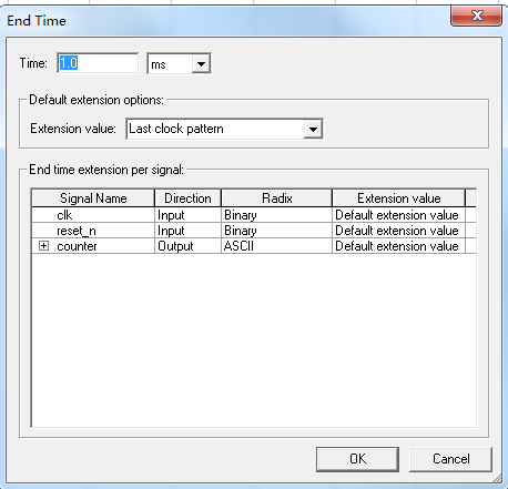 3、仿真参数设置:clk周期:50us;End Time:1ms,Grid Size:50us