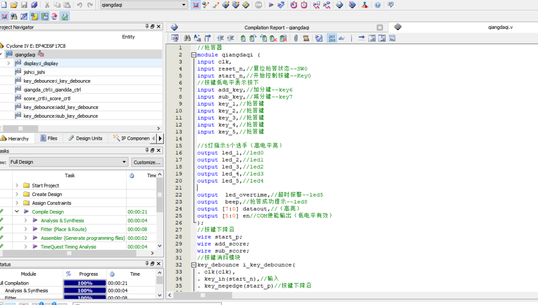 顶层qiangdaqi完成模块例化与信号连线:key_debounce产生开始键与加减分键的稳定触发脉冲;qiangda_ctrl输出系统状态、胜出者与提示信号;jishi根据状态产生倒计时与答题计时;score_crtl维护五路分数寄存器;display将状态、计时、胜出者与分数组织成数码管显示内容。整体数据流为:按键输入→消抖→状态机判定→计时/计分→显示与指示输出。