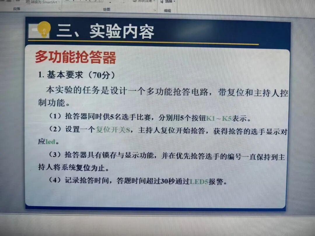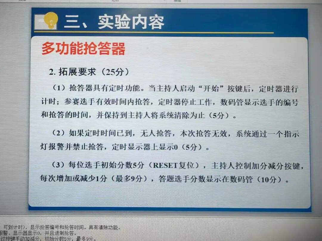 该工程实现五路抢答器:按下开始键后进入抢答倒计时,最先按下的选手按键被判定为抢答成功,对应指示灯点亮并输出提示音;若在倒计时内无人抢答则触发超时报警。系统还包含答题计时与分数加减控制,分数与状态信息通过数码管动态显示,形成“抢答-答题-计分-下一轮”的完整实验流程。