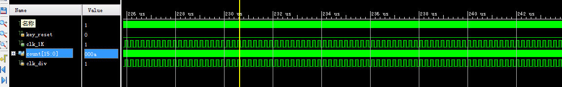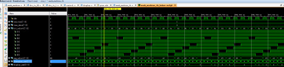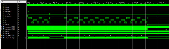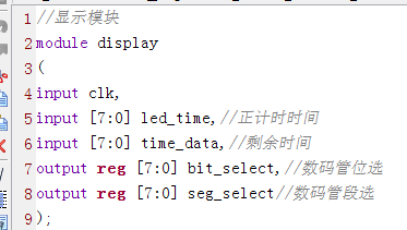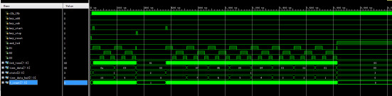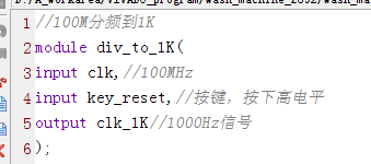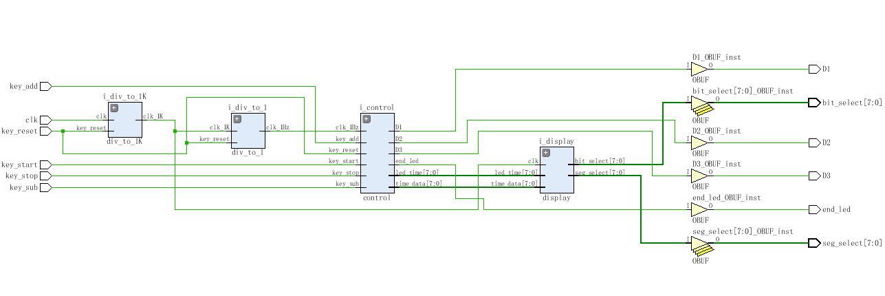 module wash_machine( input clk,//100MHz input key_add,//加按键,设置时间--BTL input key_sub,//减按键,设置时间--BTR input key_start,//启动按键--BTU input key_stop,//暂停按键,按下高电平--BTD input key_reset,//复位按键--BTC output D1,//正转 output D2,//反转 output D3,//暂停 output end_led,//结束指示灯 output stop_led, output [3:0] bit_select,//数码管位选 output [7:0] seg_select//数码管段选 ); wire clk_1Hz; wire clk_1K; wire [7:0] time_data;//剩余时间 wire [7:0] led_time;//正计时时间 //100M分频到1K div_to_1K i_div_to_1K( . clk(clk),//100MHz . key_reset(key_reset),//按键,按下高电平 . clk_1K(clk_1K)//1KHz信号 ); //1K分频到1Hz div_to_1 i_div_to_1( . clk_1K(clk_1K),//1KHz . key_reset(key_reset),//按键,按下高电平 . clk_1Hz(clk_1Hz)//1Hz信号 ); //控制模块 control i_control( . clk_1Hz(clk_1Hz),//1Hz . key_add(key_add),//加按键,按下高电平 . key_sub(key_sub),//减按键,按下高电平 . key_stop(key_stop),//暂停按键,按下高电平 . key_start(key_start),//启动按键,按下高电平 . key_reset(key_reset),//复位按键,按下高电平 . end_led(end_led), . stop_led(stop_led), . D1(D1),//正转 . D2(D2),//反转 . D3(D3),//暂停 . led_time(led_time), . time_data(time_data)//剩余时间 ); //显示模块 display i_display ( . clk(clk_1K), . led_time(led_time),//正计时时间 . time_data(time_data),//剩余时间 . bit_select(bit_select),//数码管位选 . seg_select(seg_select)//数码管段选 ); endmodule