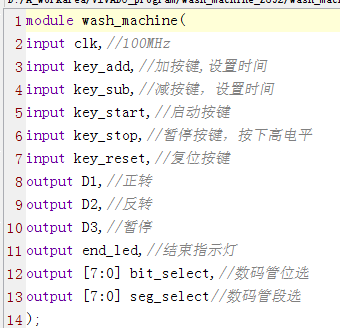 4)用两个数码管显示洗涤的预置时间(分钟数,最大3分钟),按倒计时方式显示,直到时间到停机;洗涤过程由“开始”信号开始;