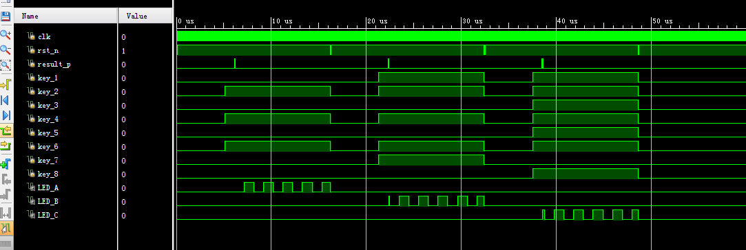 //8输入表决器 module biaojueqi( input clk,//时钟 input rst_n,//复位 input result_p,//表决结果按键 input key_1,//输入1 input key_2,//输入2 input key_3,//输入3 input key_4,//输入4 input key_5,//输入5 input key_6,//输入6 input key_7,//输入7 input key_8,//输入8 //LED灯 output reg LED_A, output reg LED_B, output reg LED_C ); wire [3:0] agree_num; assign agree_num=key_1+key_2+key_3+key_4+key_5+key_6+key_7+key_8;//计算有几个同意 reg [31:0] div_cnt=32'd0; reg clk_1HZ=0; always@(posedge clk) if(div_cnt>=32'd50_000_000)begin//计数,上板调试时计数50_000_000,仿真时为减小仿真耗时计数改为50 div_cnt<=0;//清零 clk_1HZ<=~clk_1HZ;//翻转得到1Hz的闪烁信号 end else div_cnt<=div_cnt+1;//累加 parameter s_idle=2'd0; parameter s_result=2'd1; parameter s_led=2'd2; reg [1:0] state=2'd0; //状态机 always@(posedge clk or negedge rst_n) if(rst_n==0)//复位 state<=s_idle; else case(state) s_idle://初始状态 if(result_p)//表决结果按键 state<=s_result; else state<=s_idle; s_result://表决结果状态