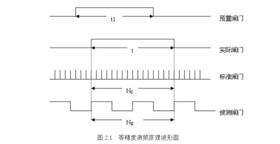 其测频原理如图2.1所示。在测量过程中,有两个计数器分别对标准信号和被测信号同时计数。首先给出闸门开启信号(预置闸门上升沿),此时计数器并不开始计数,而是等到被测信号的上升沿到来时,计数器才真正开始计数。然后预置闸门关闭信号,下降沿到时,计数器并不立即停止计数,而是等到被测信号的上升沿到来时才结束计数,完成一次测量过程。可以看出,实际闸门时间t与预置闸门时间t1并不严格相等,但差值不超过被测信号的一个周期。