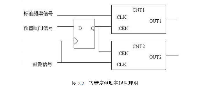 等精度测频的实现方法可简化为图2.2所示。CNT1和CNT2是两个可控计数器,标准频率信号从CNT1的时钟输入端CLK输入;经整形后的被测信号从CNT2的时钟输入端CLK输入。当预置门控信号为高电平时,经整形后的被测信号的上升沿通过D触发器的Q端同时启动CNT1和CNT2。CNT1、CNT2同时对标准频率信号和经整形后的被测信号进行计数,分别为Ns与Nx。当预置门信号为低电平的时候,后而来的被测信号的上升沿将使两个计数器同时关闭,所测得的频率为(Fs/Ns)*NX。则等精度测量方法测量精度与预置门宽度的标准频率有关,与被测信号的频率无关。在预置门时间和常规测频闸门时间相同而被测信号频率不同的情况下,等精度测量法的测量精度不变。