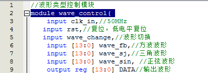 //波形类型控制模块 module wave_control( input clk_in,//50MHz input rst,//复位,低电平复位 input wave_change,//波形切换 input [13:0] wave_fb,//方波波形 input [13:0] wave_sj,//三角波形 input [13:0] wave_sin, //正弦波形 output reg [13:0] DATA//输出波形 ); reg [1:0] mode;//模式信号,01对应正弦波,10对应三角波,11对应方波 always@(posedge clk_in or negedge rst) if(rst==0)//复位 mode<=2'b01;//正弦波 else if(wave_change==1)begin//波形切换 if(mode==2'b01) mode<=2'b10;//10对应三角波 else if(mode==2'b10) mode<=2'b11;//11对应方波 else if(mode==2'b11) mode<=2'b01;//01对应正弦波 else mode<=2'b01;//正弦波 end else mode<=mode; //3选1;01对应正弦波,10对应三角波,11对应方波 always@(posedge clk_in) case(mode) 2'b01:DATA<=wave_sin; 2'b10:DATA<=wave_sj; 2'b11:DATA<=wave_fb; default:DATA<=14'd0; endcase endmodule