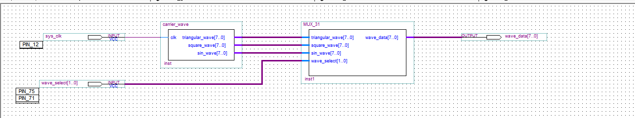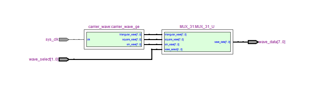 LIBRARY ieee; USE ieee.std_logic_1164.all; USE ieee.std_logic_unsigned.all; ENTITY wave_generation IS PORT ( sys_clk : IN STD_LOGIC;--输入时钟 wave_select : IN STD_LOGIC_VECTOR(1 DOWNTO 0);--波形选择 wave_data : OUT STD_LOGIC_VECTOR(7 DOWNTO 0)--波形输出 ); END wave_generation; ARCHITECTURE behaviour OF wave_generation IS --波形发生模块 COMPONENT carrier_wave IS PORT ( clk : IN STD_LOGIC; triangular_wave : OUT STD_LOGIC_VECTOR(7 DOWNTO 0); square_wave : OUT STD_LOGIC_VECTOR(7 DOWNTO 0); sin_wave : OUT STD_LOGIC_VECTOR(7 DOWNTO 0) ); END COMPONENT; --3选1模块,00输出0;01-方波;10-三角波;11-正弦波,wave_select控制3选1 COMPONENT MUX_31 IS PORT ( triangular_wave : IN STD_LOGIC_VECTOR(7 DOWNTO 0); square_wave : IN STD_LOGIC_VECTOR(7 DOWNTO 0); sin_wave : IN STD_LOGIC_VECTOR(7 DOWNTO 0); wave_select : IN STD_LOGIC_VECTOR(1 DOWNTO 0); wave_data : OUT STD_LOGIC_VECTOR(7 DOWNTO 0)--波形输出 ); END COMPONENT; SIGNAL triangular_wave : STD_LOGIC_VECTOR(7 DOWNTO 0); SIGNAL square_wave : STD_LOGIC_VECTOR(7 DOWNTO 0); SIGNAL sin_wave : STD_LOGIC_VECTOR(7 DOWNTO 0); BEGIN