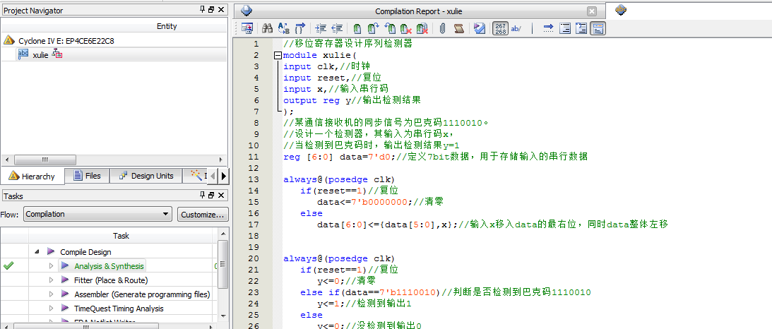 巴克码序列检测器Verilog代码Quartus仿真