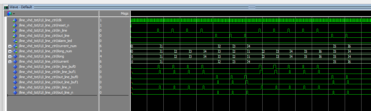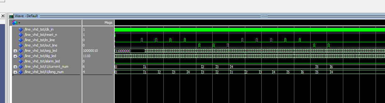 LIBRARY ieee; USE ieee.std_logic_1164.all; --排队设计 ENTITY line IS PORT ( clk_in : IN STD_LOGIC;--50MHz reset_n : IN STD_LOGIC;--复位 in_line : IN STD_LOGIC;--进队 out_line : IN STD_LOGIC;--出队 alarm_led : OUT STD_LOGIC; --溢出 dig_led : OUT STD_LOGIC_VECTOR(3 DOWNTO 0);--数码管位选 seg_led : OUT STD_LOGIC_VECTOR(7 DOWNTO 0)--数码管段选 ); END line; ARCHITECTURE behave OF line IS --50MHz分频到1KHz COMPONENT divider IS PORT ( clk_in : IN STD_LOGIC;--50MHz clk_1K : OUT STD_LOGIC--分频得到1Khz ); END COMPONENT; --显示模块 COMPONENT display IS PORT ( clk : IN STD_LOGIC; current_num : IN STD_LOGIC_VECTOR(7 DOWNTO 0);--当前号码 long_num : IN STD_LOGIC_VECTOR(7 DOWNTO 0);--队长 dig_led : OUT STD_LOGIC_VECTOR(3 DOWNTO 0);--数码管位选 seg_led : OUT STD_LOGIC_VECTOR(7 DOWNTO 0)--数码管段选 ); END COMPONENT; --排队控制模块 COMPONENT line_ctrl IS PORT ( clk : IN STD_LOGIC;--1KHz reset_n : IN STD_LOGIC;--复位 in_line : IN STD_LOGIC;--进队 out_line : IN STD_LOGIC;--出队 alarm_led : OUT STD_LOGIC; current_num : OUT STD_LOGIC_VECTOR(7 DOWNTO 0);--当前号码 long_num : OUT STD_LOGIC_VECTOR(7 DOWNTO 0)--队长 ); END COMPONENT; SIGNAL clk_1K : STD_LOGIC; SIGNAL current_num : STD_LOGIC_VECTOR(7 DOWNTO 0);--当前号码 SIGNAL long_num : STD_LOGIC_VECTOR(7 DOWNTO 0);--队长 SIGNAL dig_led_buf : STD_LOGIC_VECTOR(3 DOWNTO 0); SIGNAL seg_led_buf : STD_LOGIC_VECTOR(7 DOWNTO 0); BEGIN dig_led <= dig_led_buf; seg_led <= seg_led_buf; --50MHz分频到1KHz i_divider : divider PORT MAP ( clk_in => clk_in,--50MHz clk_1K => clk_1K--分频得到1Khz ); --排队控制模块 i_line_ctrl : line_ctrl PORT MAP ( clk => clk_1K,--1KHz reset_n => reset_n,--复位 in_line => in_line,--进队 out_line => out_line,--出队 alarm_led => alarm_led,--溢出报警 current_num => current_num,--当前号码 long_num => long_num--队长 );