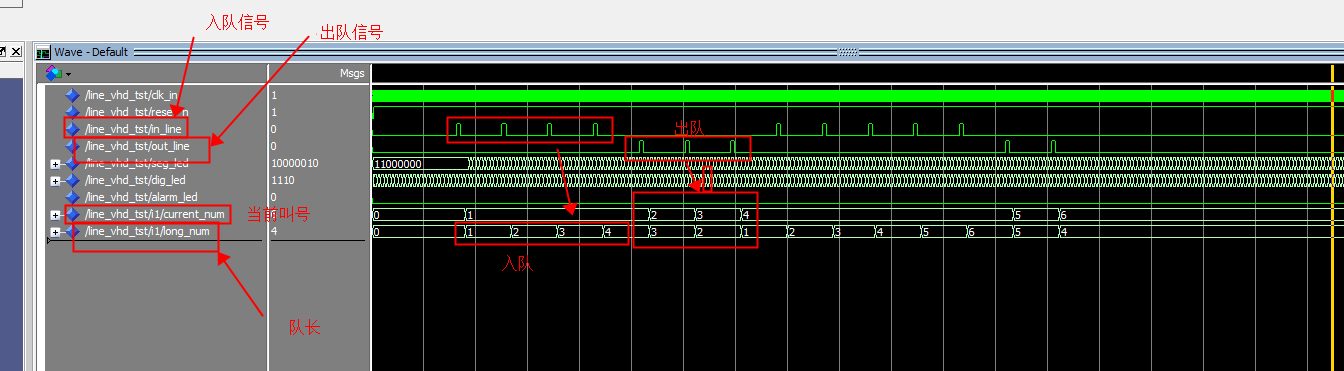 在EDA平台下使用VDL语言为工具,设计单窗口排队机电路,给每个新加入排队人员编号,并计算队伍长度。