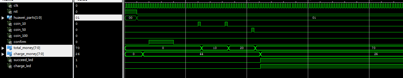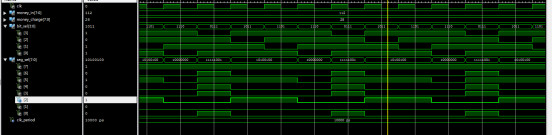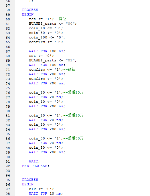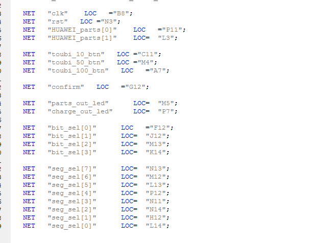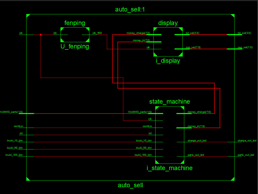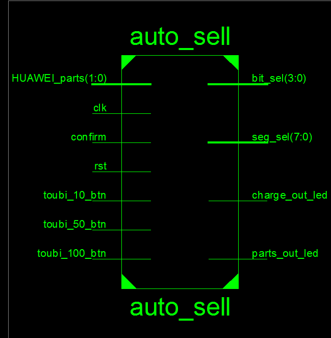 LIBRARY ieee; USE ieee.std_logic_1164.all; ENTITY auto_sell IS PORT ( clk : IN STD_LOGIC; rst : IN STD_LOGIC;--复位 HUAWEI_parts : IN STD_LOGIC_VECTOR(1 DOWNTO 0);--手机配件选择 toubi_10_btn : IN STD_LOGIC;--投币10元 toubi_50_btn : IN STD_LOGIC;--投币50元 toubi_100_btn : IN STD_LOGIC;--投币100元 confirm : IN STD_LOGIC;--确认 parts_out_led : OUT STD_LOGIC;--输出配件指示灯 charge_out_led : OUT STD_LOGIC;--找零指示灯 bit_sel : OUT STD_LOGIC_VECTOR(3 DOWNTO 0);--数码管位选 seg_sel : OUT STD_LOGIC_VECTOR(7 DOWNTO 0)--数码管段选 ); END auto_sell; ARCHITECTURE behave OF auto_sell IS --状态机模块 COMPONENT state_machine IS PORT ( clk : IN STD_LOGIC; rst : IN STD_LOGIC;--复位 HUAWEI_parts : IN STD_LOGIC_VECTOR(1 DOWNTO 0);--手机配件选择 toubi_10_btn : IN STD_LOGIC;--投币10元 toubi_50_btn : IN STD_LOGIC;--投币50元 toubi_100_btn : IN STD_LOGIC;--投币100元 confirm : IN STD_LOGIC;--确认 money_in : OUT STD_LOGIC_VECTOR(7 DOWNTO 0);--总投币 money_charge : OUT STD_LOGIC_VECTOR(7 DOWNTO 0);--找零 parts_out_led : OUT STD_LOGIC;--输出配件指示灯 charge_out_led : OUT STD_LOGIC--找零指示灯 );