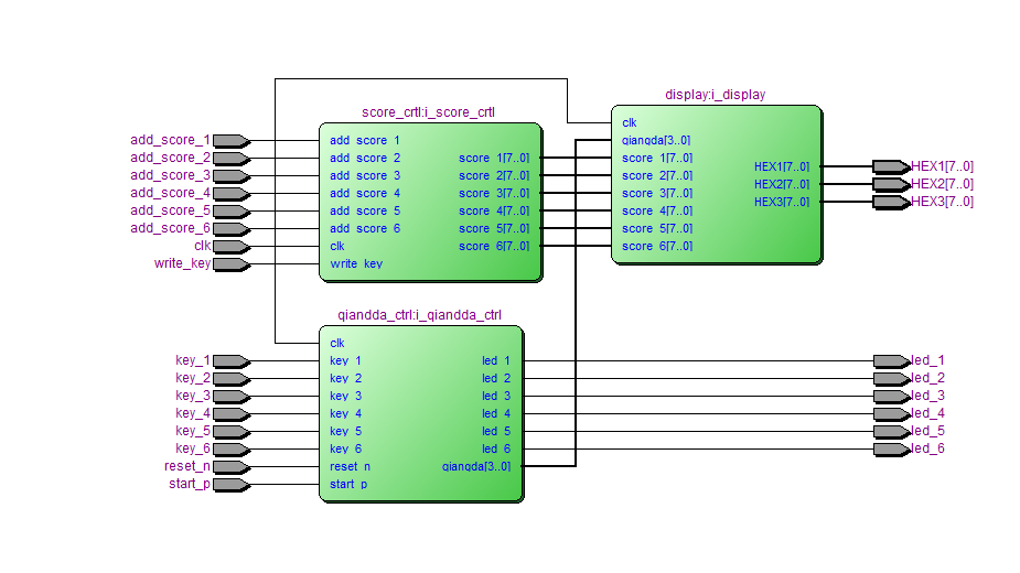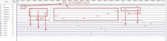 上图中,仿真了分数控制模块,write_kety高电平表示答对。当答对时,按下加分按键才能加10分,否则不能加分