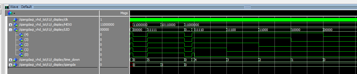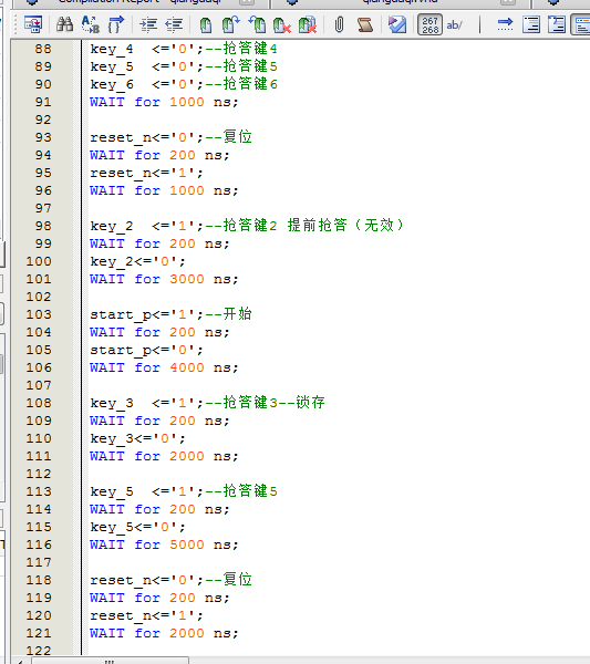 LIBRARY ieee; USE ieee.std_logic_1164.all; USE ieee.std_logic_unsigned.all; --抢答器控制模块 ENTITY qiandda_ctrl IS PORT ( clk : IN STD_LOGIC;--时钟 clk_1Hz : IN STD_LOGIC;--1Hz时钟 reset_n : IN STD_LOGIC;--复位 start_p : IN STD_LOGIC;--开始 --6个抢答按键 key_1 : IN STD_LOGIC; key_2 : IN STD_LOGIC; key_3 : IN STD_LOGIC; key_4 : IN STD_LOGIC; key_5 : IN STD_LOGIC; key_6 : IN STD_LOGIC; led_overtime : OUT STD_LOGIC;--超时报警(蜂鸣器) time_down : OUT STD_LOGIC_VECTOR(3 DOWNTO 0);--倒计时 qiangda : OUT STD_LOGIC_VECTOR(3 DOWNTO 0)--抢答号 ); END qiandda_ctrl; ARCHITECTURE behavioral OF qiandda_ctrl IS --定义状态 constant s_idle : STD_LOGIC_VECTOR(3 DOWNTO 0) := "0000"; constant s_start : STD_LOGIC_VECTOR(3 DOWNTO 0) := "0001"; constant s_timedown : STD_LOGIC_VECTOR(3 DOWNTO 0) := "0010"; constant s_qianda_1 : STD_LOGIC_VECTOR(3 DOWNTO 0) := "0111"; constant s_qianda_2 : STD_LOGIC_VECTOR(3 DOWNTO 0) := "1000"; constant s_qianda_3 : STD_LOGIC_VECTOR(3 DOWNTO 0) := "1001"; constant s_qianda_4 : STD_LOGIC_VECTOR(3 DOWNTO 0) := "1010"; constant s_qianda_5 : STD_LOGIC_VECTOR(3 DOWNTO 0) := "1011"; constant s_qianda_6 : STD_LOGIC_VECTOR(3 DOWNTO 0) := "1100"; constant s_overtime : STD_LOGIC_VECTOR(3 DOWNTO 0) := "1111"; --内部信号 SIGNAL qiangda_temp : STD_LOGIC_VECTOR(3 DOWNTO 0); SIGNAL state : STD_LOGIC_VECTOR(3 DOWNTO 0) := "0000"; SIGNAL time_cnt : STD_LOGIC_VECTOR(3 DOWNTO 0) := "0101"; SIGNAL wait_cnt : STD_LOGIC_VECTOR(3 DOWNTO 0) := "0000"; BEGIN --定时电路 --控制倒计时 PROCESS (clk, reset_n) BEGIN IF ((NOT(reset_n)) = '1') THEN time_cnt <= "0000"; ELSIF (clk'EVENT AND clk = '1') THEN IF (state = s_start) THEN time_cnt <= "0101";--起始时间5秒 ELSIF (state = s_timedown and clk_1Hz='1') THEN--倒计时,每秒倒计时1 time_cnt <= time_cnt - "0001"; END IF; END IF; END PROCESS; PROCESS (clk, reset_n) BEGIN IF ((NOT(reset_n)) = '1') THEN wait_cnt <= "0000"; ELSIF (clk'EVENT AND clk = '1') THEN IF (state = s_idle) THEN wait_cnt <= "0000";--0 ELSIF (state = s_overtime and clk_1Hz='1') THEN--超时 wait_cnt <= wait_cnt + "0001"; END IF; END IF; END PROCESS; time_down <= time_cnt;--倒计时