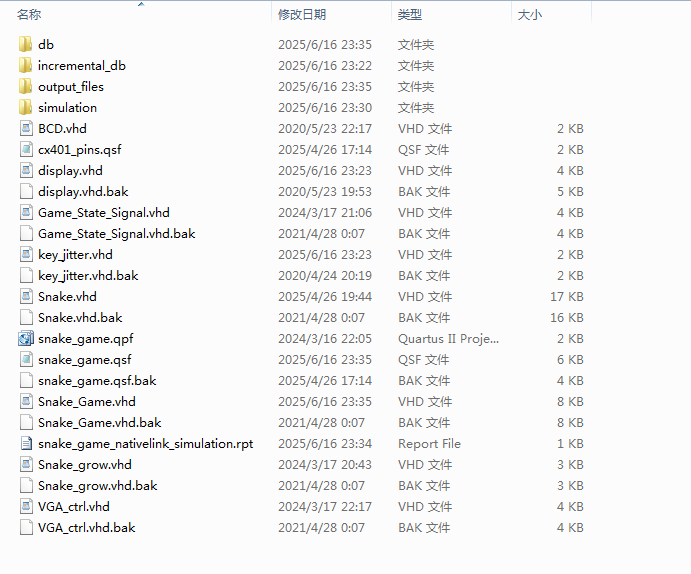 ·Snake_grow.vhd:食物位置与增长控制,包含伪随机数生成与吃食检测。