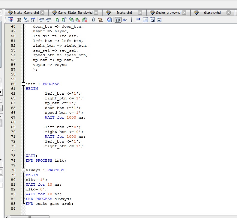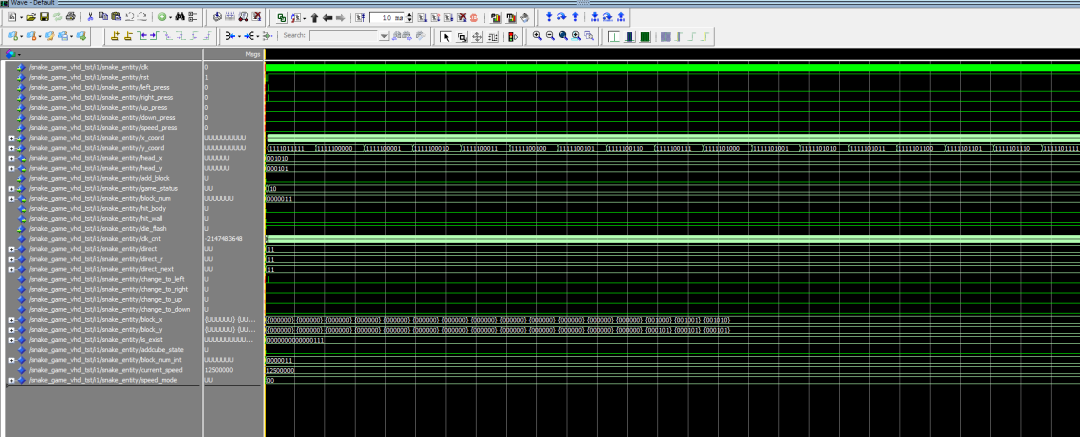 ·snake.vhd:核心游戏逻辑,维护蛇身数组、移动与转向逻辑、碰撞检测与增长处理。